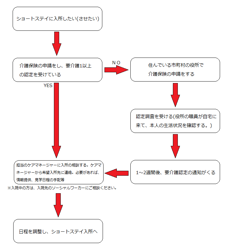 ショートステイに入所するには、要介護1以上の介護認定が必要になります。ケアマネージャーがついている方は、ケアマネージャーにご相談ください。ケアマネージャーがついていない方や介護保険の申請をされていない方は近隣の居宅介護支援事業所やケアプランセンターにご相談下さい。その後、当院との契約を結び、入所日を決め、入所になります。事前の見学等も可能です。(図1 参照)※当院にも併設居宅介護支援事業所があります。